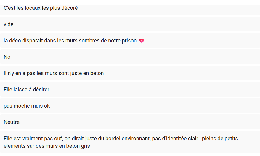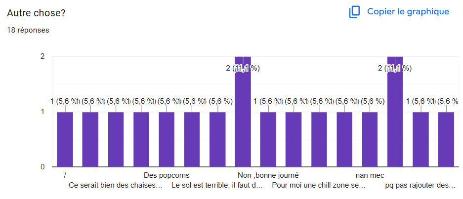 Étant limité par certaines contraintes techniques telles que le budget, nous avons orienté les questions vers des aspects que nous pouvons contrôler plus facilement c'est-à-dire majoritairement la décoration. Nous avons aussi évoqué une idée que nous avons eue lors de nos discussions en groupe : celle de la “chill zone".