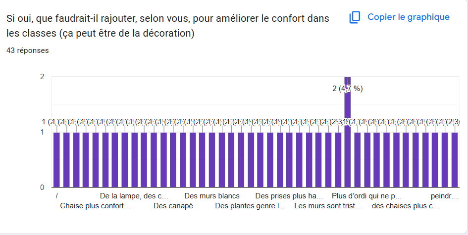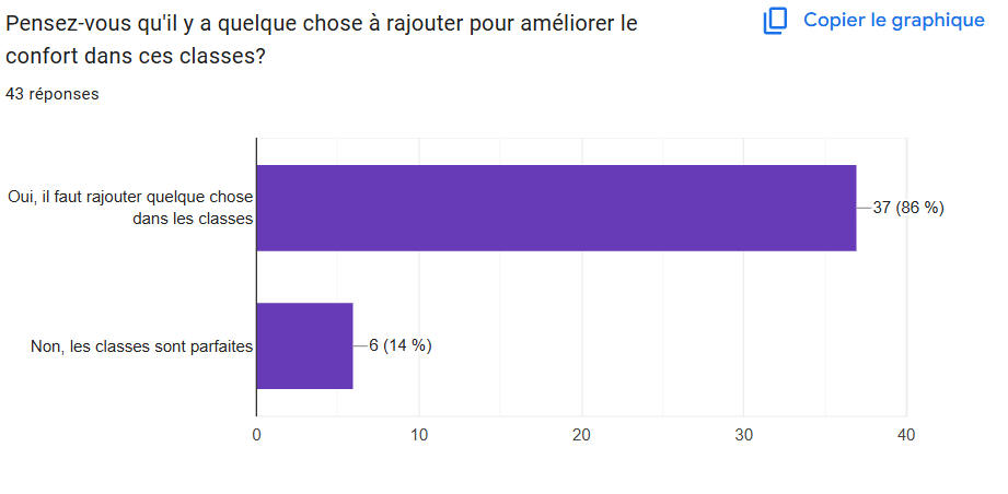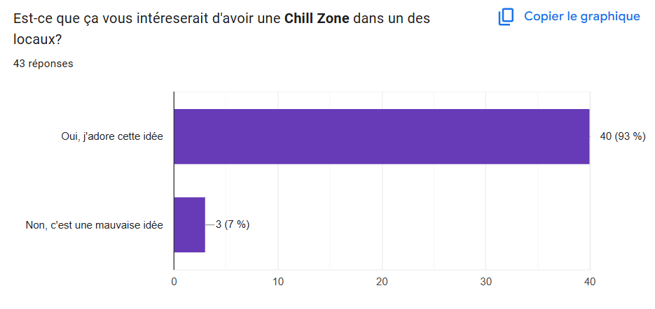Comme évoqué précédemment, la “chill zone”. 93 % des étudiants interrogés se montrent favorables à cette idée. L’idée derrière ce concept est de créer un coin qui permettrait aux étudiants de renforcer leurs liens. Nous pensions y ajouter une machine à café/thé et quelques sièges confortables tels que des pouffes.
