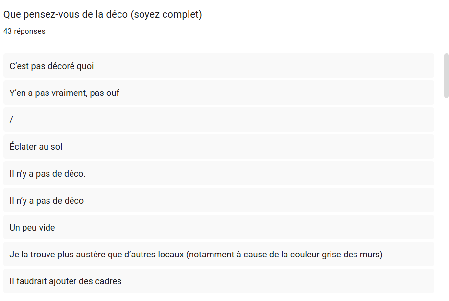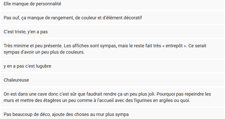 Étant limité par certaines contraintes techniques telles que le budget, nous avons orienté les questions vers des aspects que nous pouvons contrôler plus facilement c'est-à-dire majoritairement la décoration. Nous avons aussi évoqué une idée que nous avons eue lors de nos discussions en groupe : celle de la “chill zone".